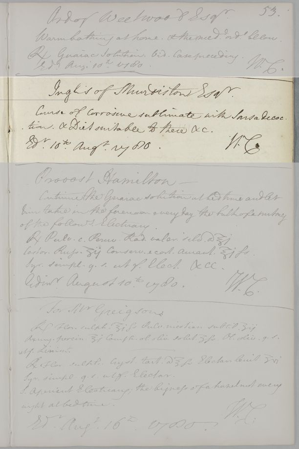 [ID:1004] From: Dr William Cullen (Professor Cullen) / To: Mr Alexander Hamilton Inglis (of Murdist(o)un; Alexander Inglis Hamilton) / Regarding: Mr Alexander Hamilton Inglis (of Murdist(o)un; Alexander Inglis Hamilton) (Patient) / 10 August 1780 / (Outgoing)