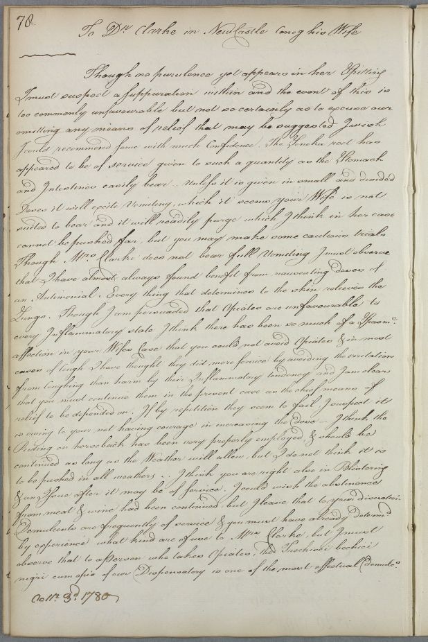 [ID:1028] From: Dr William Cullen (Professor Cullen) / To: Dr John Clark (Clerke, Clarke) / Regarding: Mrs Clark (Clerke, Clarke) (Patient) / 3 October 1780 / (Outgoing)
