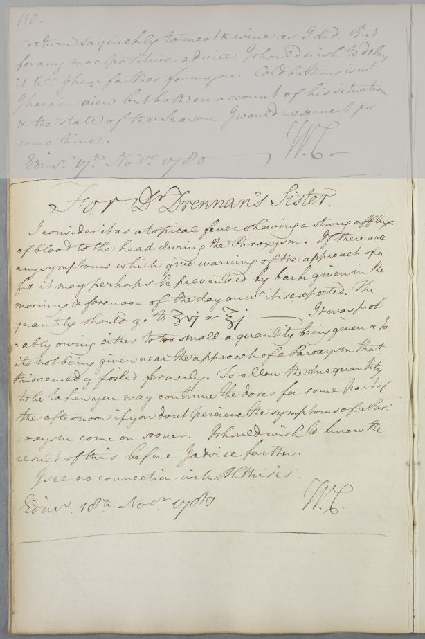 | Summary | Reply 'For Dr Drennan's Sister', whose case Cullen believes to consist of a fever along with 'a strong afflux of blood to the head during the Paroxysm'. |