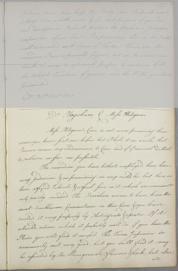 | Summary | Reply, 'Dr Heysham C[oncerning] Miss Hodgson', whose disease is proving difficult to cure. |