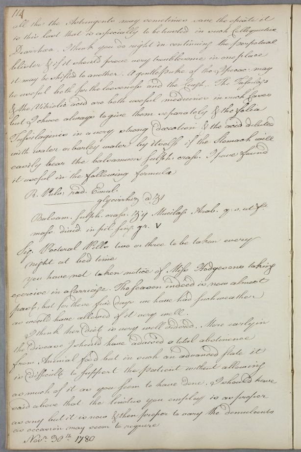 [ID:1056] From: Dr William Cullen (Professor Cullen) / To: [ADDRESSEE UNKNOWN] / Regarding: Miss Hodgson (Hodgeson) (Patient) / 30 November 1780 / (Outgoing)