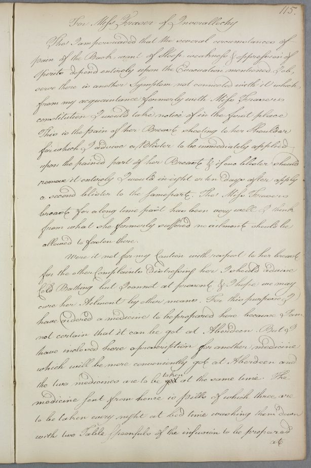 Case of Miss Fraser of Inverallochy who is weakened and has a shooting pain from her breast to her shoulder. |