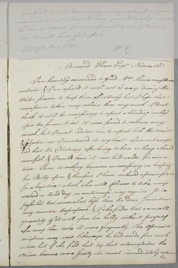 Reply to Bernard Shaw of Newcastle concerning his wife Mrs Shaw. Cullen is concerned to find out that her complaints continue, and worries that it will be difficult to remedy them during the winter season.
