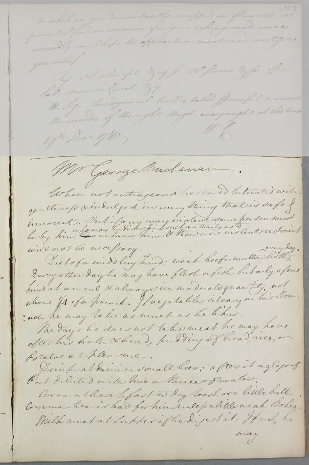 | Summary | Reply giving directions for the care of Mr George Buchanan. 'When not outrageous he should be treated with gentleness & indulged in every thing that is safe & innocent'; he is to have 'two or three large chambers to walk about in', with the windows screwed down but his diet is to be changed if he becomes violent. |