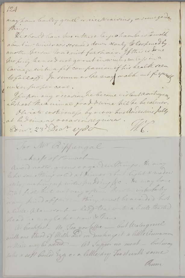Reply giving directions for the care of Mr George Buchanan. 'When not outrageous he should be treated with gentleness & indulged in every thing that is safe & innocent'; he is to have 'two or three large chambers to walk about in', with the windows screwed down but his diet is to be changed if he becomes violent.