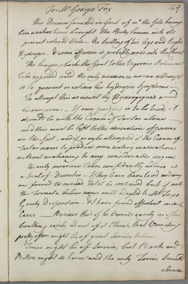 Directions for George Fox, whose disease is 'founded in Gout',. Date of January 1781 'inferred', from the incoming letter.