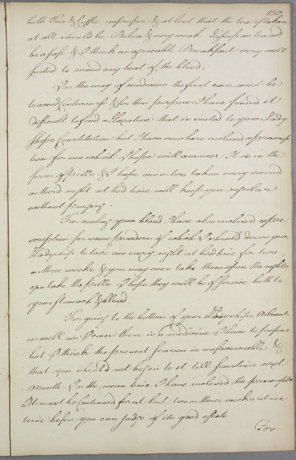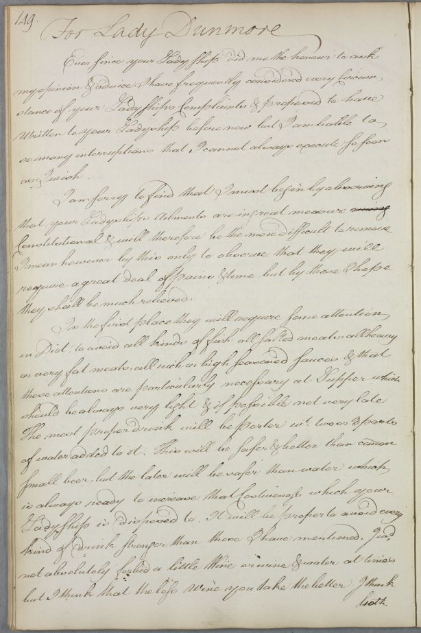 | Summary | Reply 'For Lady Dunmore', explaining that Cullen has 'frequently considered every Circumstance of your Ladyships Complaints', and apologising for not writing sooner; 'your Ladyships ailments are in great measure Constitutional & will therefore be the more difficult to remove'. He provides dietary advice and several recipes. |