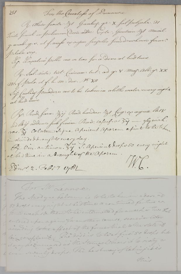 [ID:1083] From: Dr William Cullen (Professor Cullen) / To: Countess Charlotte Murray (Stewart) (Lady Dunmore) / Regarding: Countess Charlotte Murray (Stewart) (Lady Dunmore) (Patient) / 2 February 1781 / (Outgoing)