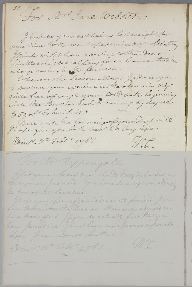 | Summary | Reply 'For Mrs Jane Webster. Cullen suggests that the reason she has not lost weight for some time is 'the want of exercise & of cold bathing', and recommends shuttlecock and walking for an hour or two in a large room. |