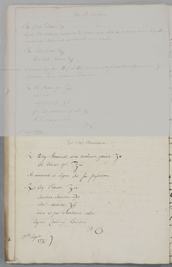 Recipes 'For Mr Maclean' These two prescriptions may well relate to the case discussed in the previous letter, but they amount to a separate entry with a distinct dateline. The earlier prescription was designed to promote sweating, whereas one of these is for a 'cooling lotion'.