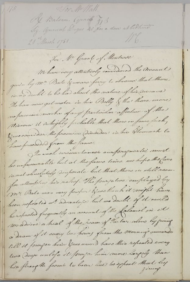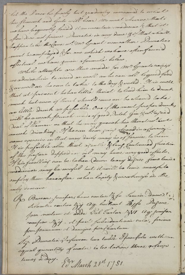 | Summary | Reply giving directions for Mr Grant of Montrose, probably sent to his son James, and discussing his treatment by John Bate. Cullen writes: 'we are sorry to observe that there is no doubt to be had about the nature of his disease He has now got water in his Belly'. He supports the use of Cream of Tartar. Mentions Dr Stork's use of crocus. |