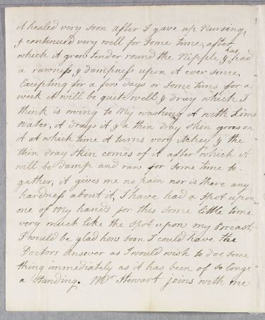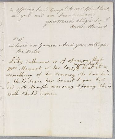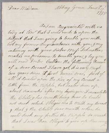 Letter from Anne Stewart, Abbey Green (Lesmahagow), relating her own case of 'a soar Breast I have got' since breastfeeding her baby two years before. Letter addressed to Mrs [Sarah] Blacklock, requesting that she read it to Cullen. The sender is a friend of Mrs Blacklock's sister, Miss Johnston and she also sends compliments to Sarah's husband, Dr Thomas Blacklock, the blind poet and scholar who, with his wife, ran a boarding house in Edinburgh mainly patronised by medical students. There is a note in another hand (almost certainly that of Mrs Blacklock's) commenting on Anne Stewart's case.