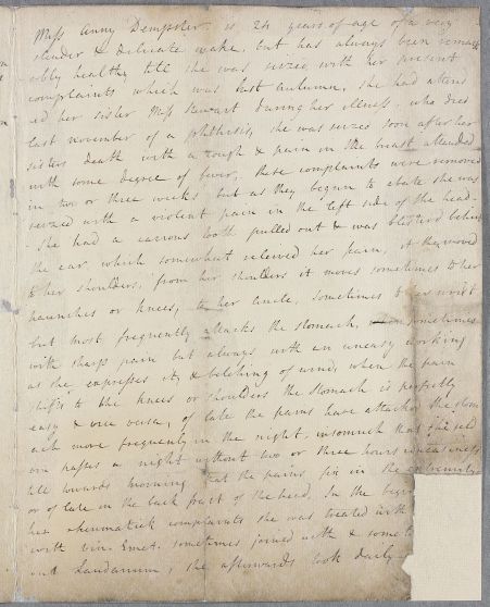 | Summary | Letter from Dr Douglas relating the case of Anny Dempster, who has suffered from a cough and fever followed by a 'violent pain' in one side of her head. |