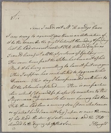 Letter from Dr Thomas Yorstoun [Yerstoun] at Waterside, Dumfries, addressed to Walter Riddell at (Friars') Carse, regarding the case of his friend Mr Kennedy whose condition has worsened to include several fits 'w[ith] all the symptoms of Epilepsy'. He traces the condition back to a sore on Mr Kennedy's head, and refers to his treatment with a seton.