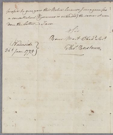 | Summary | Letter from Dr Thomas Yorstoun [Yerstoun] at Waterside, Dumfries, addressed to Walter Riddell at (Friars') Carse, regarding the case of his friend Mr Kennedy whose condition has worsened to include several fits 'w[ith] all the symptoms of Epilepsy'. He traces the condition back to a sore on Mr Kennedy's head, and refers to his treatment with a seton. |