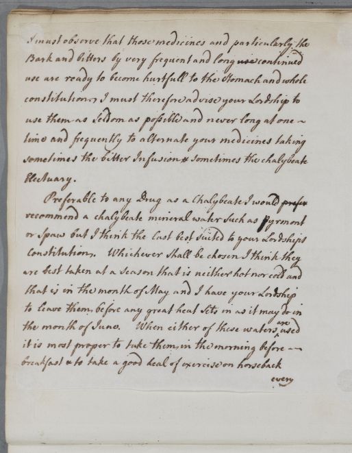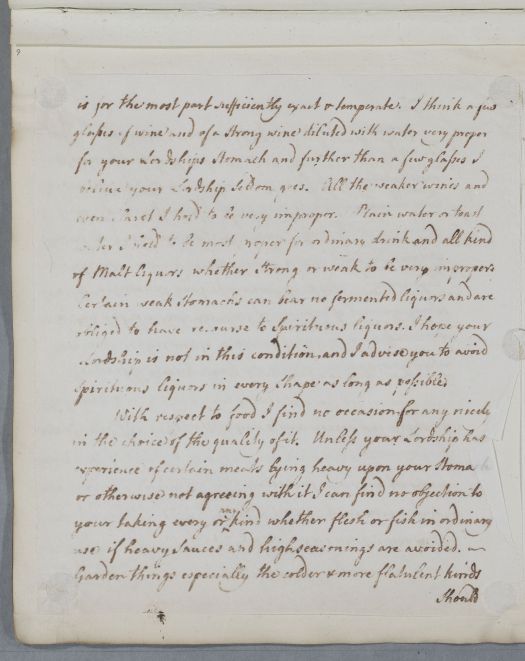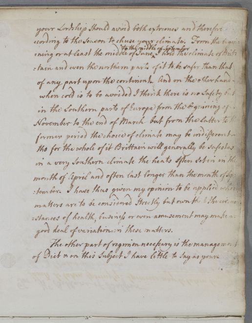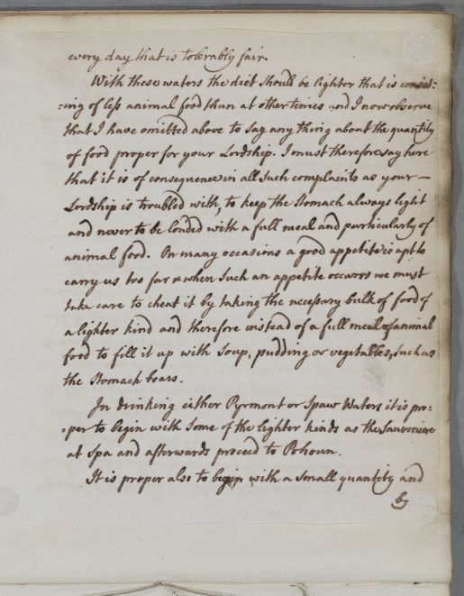 Reply to the Earl of Findlater with an extensive regimen, covering his diet, changes of climate, and the use of mineral waters (Pyrmont and Spa). The first few lines on p. 4 appear to be in another hand and, unusually, there is a blank page in the run of mounted machine copied pages.