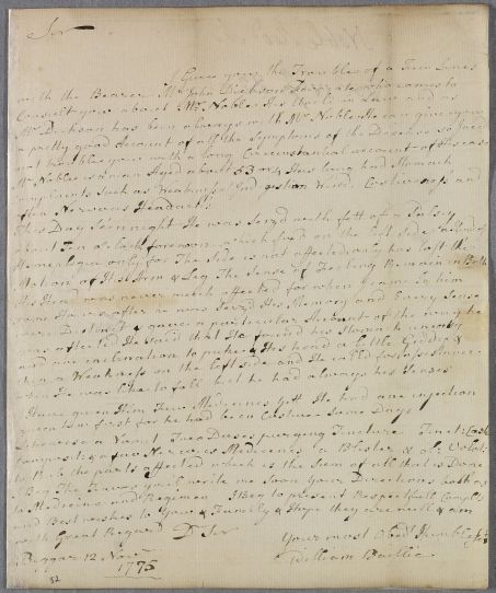 [ID:1176] From: Mr William Baillie / To: Dr William Cullen (Professor Cullen) / Regarding: Reverend John Noble (of Libberton) (Patient) / 12 November 1775 / (Incoming)