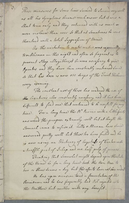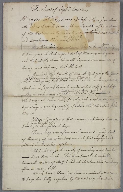 Corrected draft in Cullen's hand of a heavily corrected case note, which then moves on to provide advice concerning a Captain Corsan who has had gonorrhea. Undated, but year estimated from internal evidence.