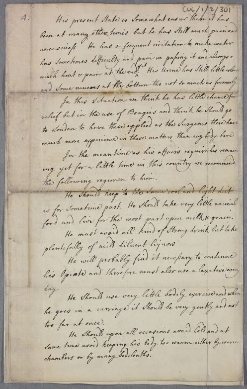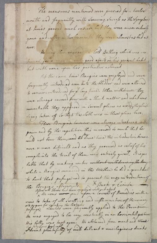 | Summary | Corrected draft in Cullen's hand of a heavily corrected case note, which then moves on to provide advice concerning a Captain Corsan who has had gonorrhea. Undated, but year estimated from internal evidence. |