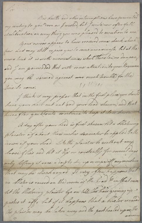 Incomplete directions for an unnamed adult male patient who has suffered from giddiness but has regular bowels. Cullen recommends that he shave and blister his head, and try sea-bathing at Holy Island (possibly Lindisfarne) after 1 June. He also tells the patient that he has ordered a bathing machine for him. Last pages, which include a Cephalic Electuary recipe, are missing from the letter.