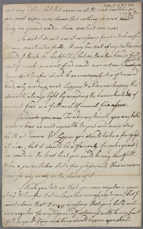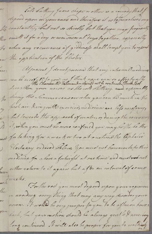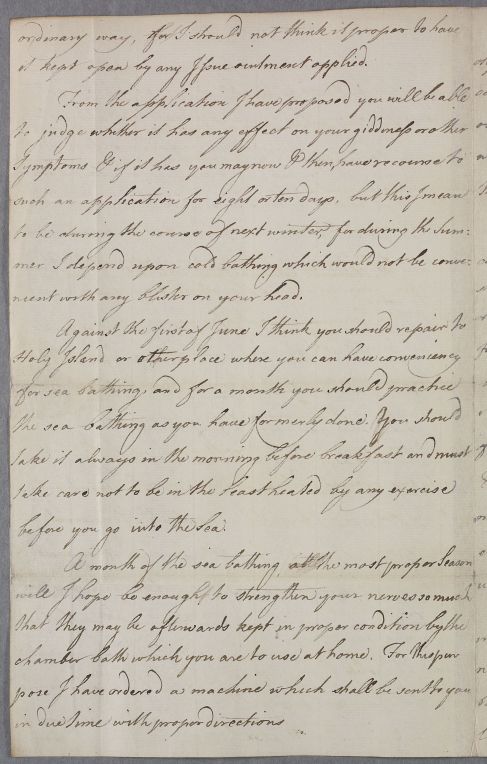 | Summary | Incomplete directions for an unnamed adult male patient who has suffered from giddiness but has regular bowels. Cullen recommends that he shave and blister his head, and try sea-bathing at Holy Island (possibly Lindisfarne) after 1 June. He also tells the patient that he has ordered a bathing machine for him. Last pages, which include a Cephalic Electuary recipe, are missing from the letter. |