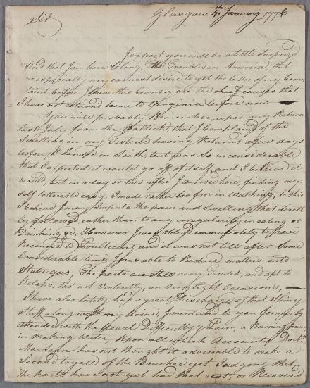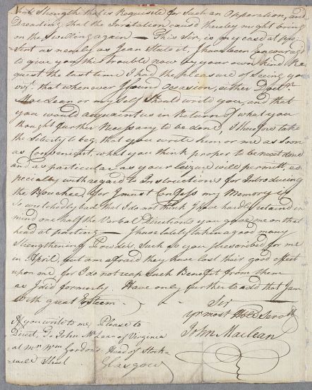 | Summary | Letter from John Maclean regarding his own case which involves a swollen testicle. His return to Virginia has been delayed by 'The Troubles in America, but [...] especially my earnest desire to get the better of my Complaint before I leave this country'. |
