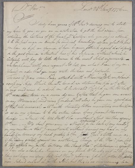 Letter from William Borradaile writing from London, addressed to his brother in Edinburgh, in response to the brother's untraced letter 'desiring me to state my Case to you, as you are in a situation to get the best advice by attending the Lectures of the Great Dr. Cullen'. The writer believes that his complaints, which are various, were aggravated by being prescribed mercury which has injured his nerves.