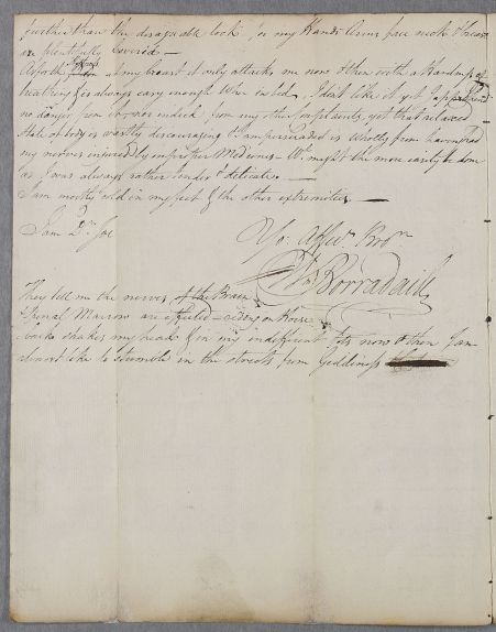 | Summary | Letter from William Borradaile writing from London, addressed to his brother in Edinburgh, in response to the brother's untraced letter 'desiring me to state my Case to you, as you are in a situation to get the best advice by attending the Lectures of the Great Dr. Cullen'. The writer believes that his complaints, which are various, were aggravated by being prescribed mercury which has injured his nerves. |
