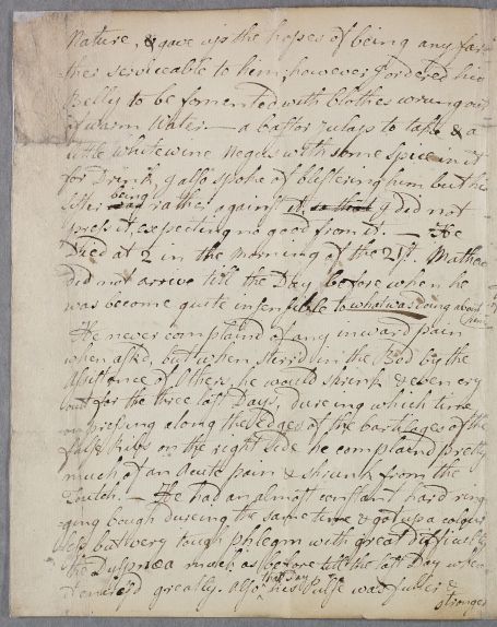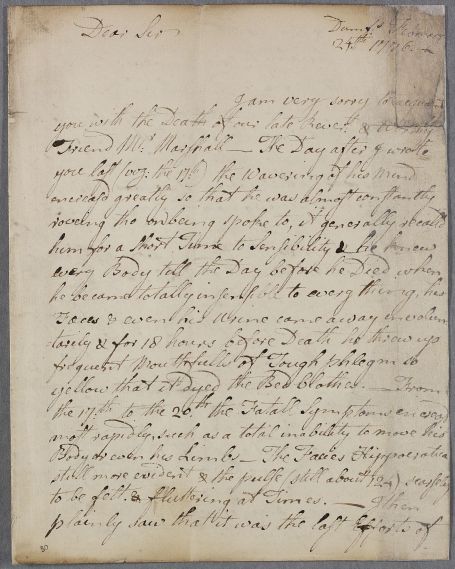 Letter from the Dumfries surgeon Alexander Copland addressed to Mr Richard Allen at Edinburgh Infirmary describing the final days of the Reverend Marshall followed by a post mortem report on the autopsy. By 'roveling', a word associated with spinning, Copland presumably means "roving in his thoughts", but this usage is not in the OED.