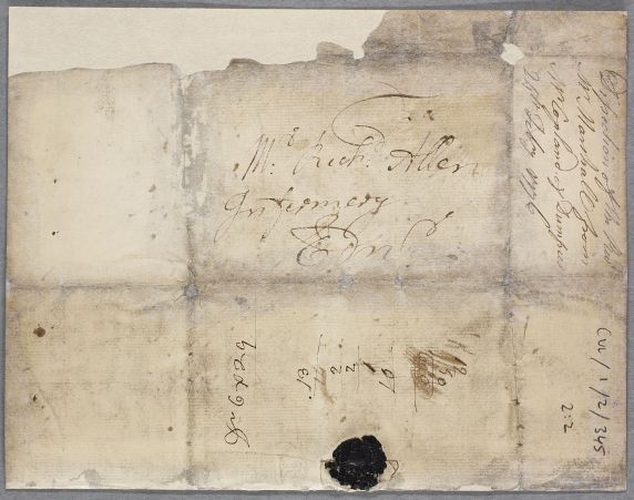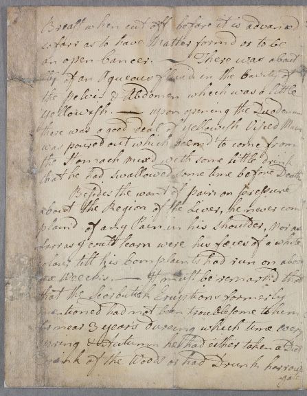 | Summary | Letter from the Dumfries surgeon Alexander Copland addressed to Mr Richard Allen at Edinburgh Infirmary describing the final days of the Reverend Marshall followed by a post mortem report on the autopsy. By 'roveling', a word associated with spinning, Copland presumably means "roving in his thoughts", but this usage is not in the OED. |