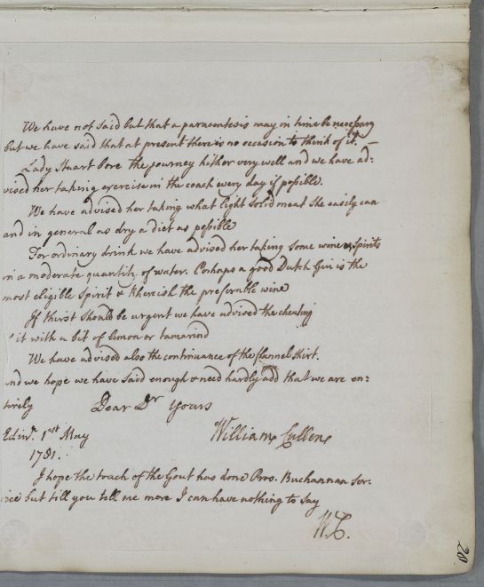 [ID:128] From: Dr William Cullen (Professor Cullen) / To: Dr Alexander Stevenson (Professor; of Dalgairn ) / Regarding: Commissioner James Buchanan (Provost Buchanan; formerly of Drumpellier) (Patient), Lady Helen Stuart (Orr) (Stewart; of Castlemilk) (Patient) / 1 May 1781 / (Outgoing)