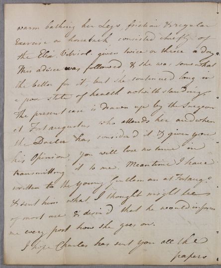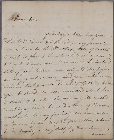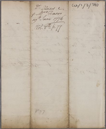 | Summary | Letter from John Alves, addressed to the brother of a patient, Mrs Frazer. Alves, who was given the letter by Dr Fraser 'whose state of health is such at present that he could not answer it', tells the addressee that 'your Father is desirous that you should take Dr Cullen's advice' and mentions that Cullen was consulted about her case in the winter of 1765. |
