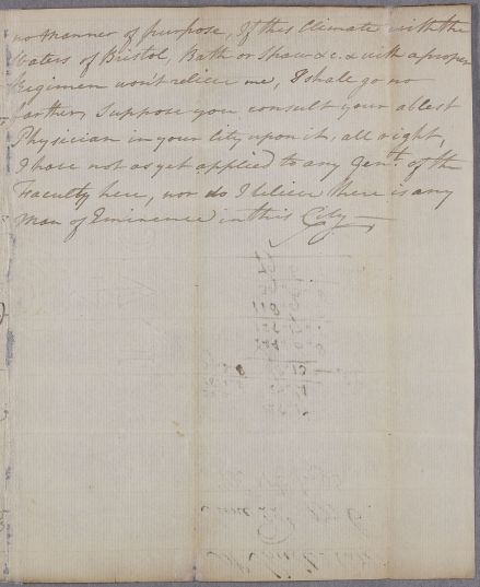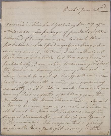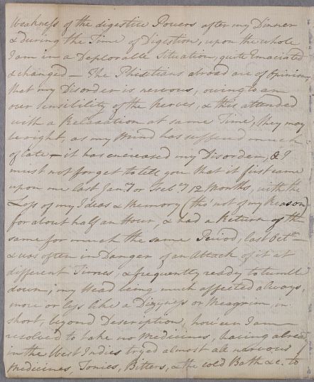 Letter from an unnamed patient to his friend Mr Shiells, who is requested to pass the letter on to a physician. He has recently arrived in Bristol 'after a tolerable good passage of five Weeks', during which he 'often despaired of being ever able to reach this port alive', He has suffered from 'nervous weakness' since being in the West Indies.