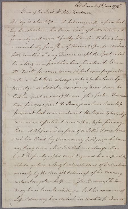 [ID:1296] Cover Letter and Case Note / Regarding: Reverend Peter Yorstoun (of Closeburn & Dalgarnoch; Yerstoun, Yorkston) (Patient) / 24 June 1776 / (Incoming)