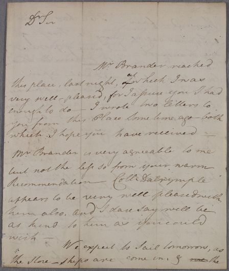 Letter from Richard Allan, mentioning Mr Brander, Captain Commandant Dalrymple, his impending voyage, and an outbreak of typhus amongst troops on a transport ship which alarmed Dr Lind. A handstamp is present but illegible: possibly "Southampton".