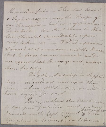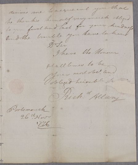 | Summary | Letter from Richard Allan, mentioning Mr Brander, Captain Commandant Dalrymple, his impending voyage, and an outbreak of typhus amongst troops on a transport ship which alarmed Dr Lind. A handstamp is present but illegible: possibly "Southampton". |