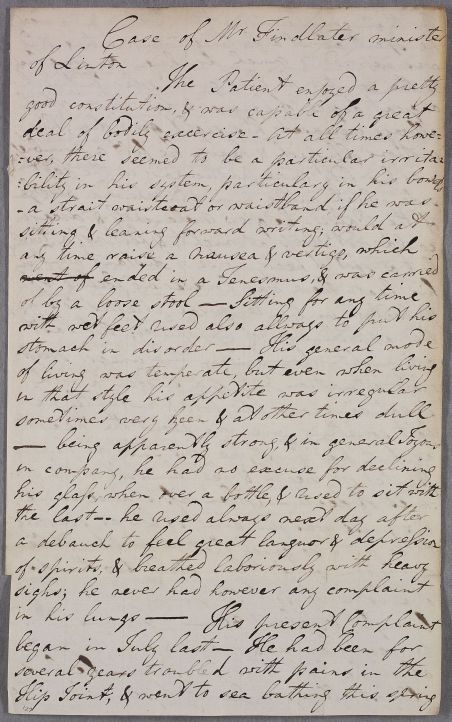 | Summary | Letter setting out the case of the Reverend Findlater, minister of Linton, whose complaints are related to his very convivial drinking habits. |