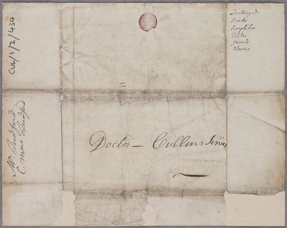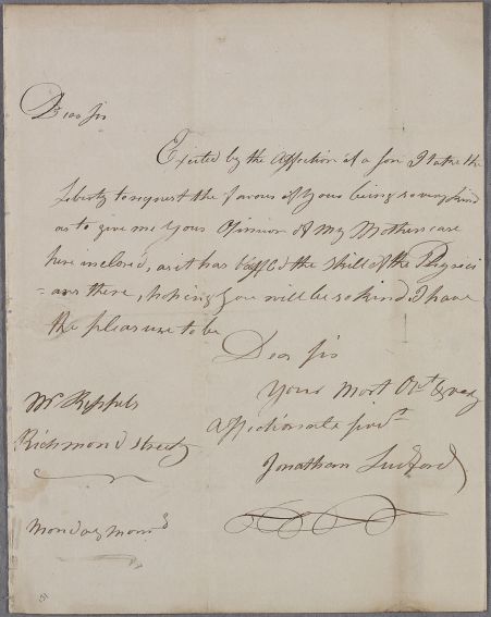 | Summary | Letter from Jonathan Ludford, enclosing an account of the case of his mother, Mrs. Ludford. The enclosure is missing. The date is inferred as the 'Monday morning' preceding Cullen's reply. A list of classes of creatures has been made on the exterior. |
