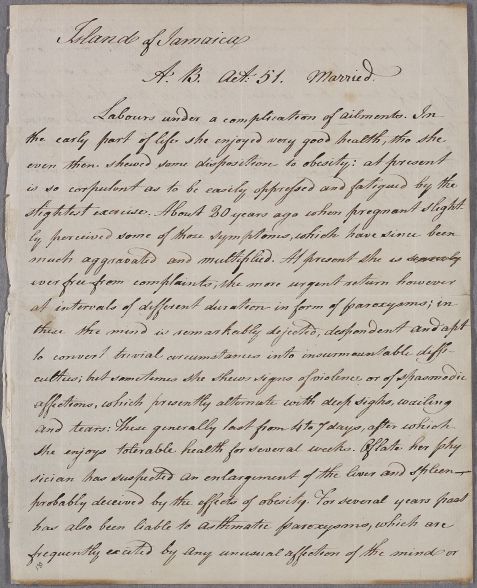 | Summary | Case note concerning the case of 'A. B.', a female patient from Jamaica. She 'at present is so corpulent as to be easily oppressed and fatigued by the slightest exercise', and is 'remarkably dejected, despondent and apt to convert trivial circumstances into insurmountable difficulties'. |