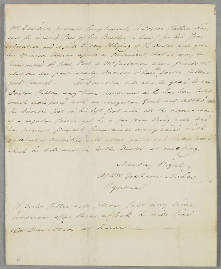 | Summary | Covering letter from John Davidson of Ravelrigg to arrange a meeting with Cullen, regarding the case of his brother-in-law Robert Sanderson, and mentioning his own symptoms of 'an irregular Gout' and anxiety. He is staying at Mr Graham's house in Milne's Square. |