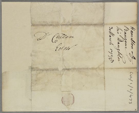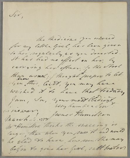| Summary | Letter from James Hamilton of Bangour regarding the case of his daughter Polly. A short note to say the medicines have had not effect other than being laxative. |
