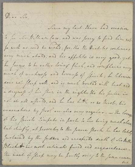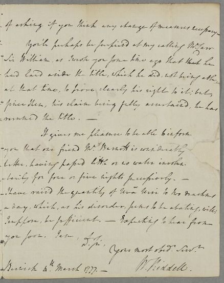 [ID:1379] From: Dr Walter Riddell / To: Dr William Cullen (Professor Cullen) / Regarding: Sir William Carr (of Etal; Kerr, Carre) (Patient), Mr W. Barnett (Patient) / 4 March 1777 / (Incoming)