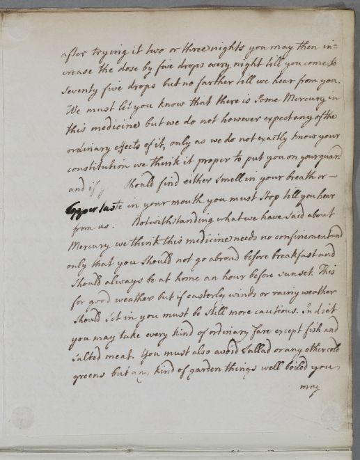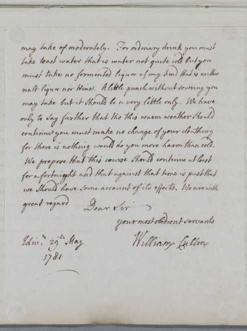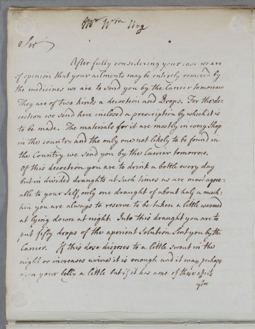 | Summary | Reply, 'Mr Wm Hog', regarding diet and exercise and also instructing him to take 'the aperient solution sent to you by the Carrier'. The use of the second person plural here seems to indicate a joint consultation with Alexander Wood, as implied in Hogg's reply, Doc [ID:2017] . |