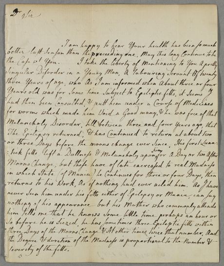 Letter from Jasper Tough, regarding an unnamed male patient, a household servant, described as being epileptic and developing mania.