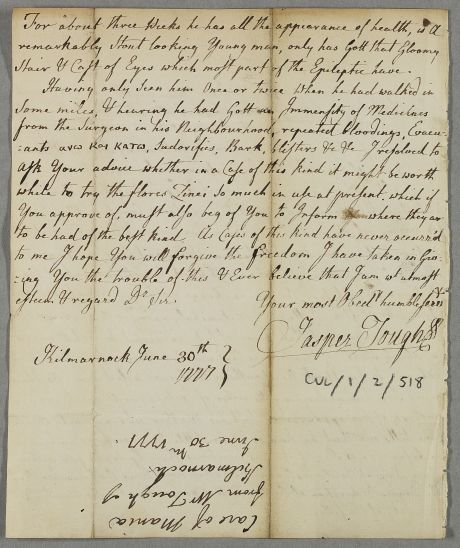 [ID:1423] From: Dr Jasper Tough / To: Dr William Cullen (Professor Cullen) / Regarding: Mr (Patient) / 30 June 1777 / (Incoming)
