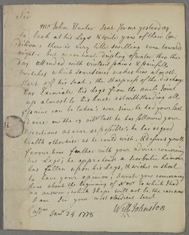 | Summary | Letter from William Johnstone, surgeon in Coldstream, regarding the case of John Hunter of Crooks, whom he has visited. Hunter's dropsical legs are leaking, and 'The sharpness of the discharge has Excoriate his Legs from the ancle joint up almost to his knee'. He asks Cullen's advice. Hunter attributes his condition to a 'scorbutic humour'. |