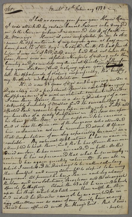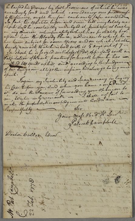 [ID:1494] From: Mr Patrick Campbell (of Raschoille; in Greenock) / To: Dr William Cullen (Professor Cullen) / Regarding: Mr Donald Campbell (of Rudil) (Patient) / 20 February 1778 / (Incoming)