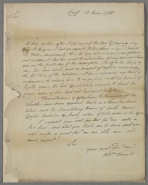 | Summary | Letter from William Wright, concerning the case of his elderly father who suffers from urinary retention. |