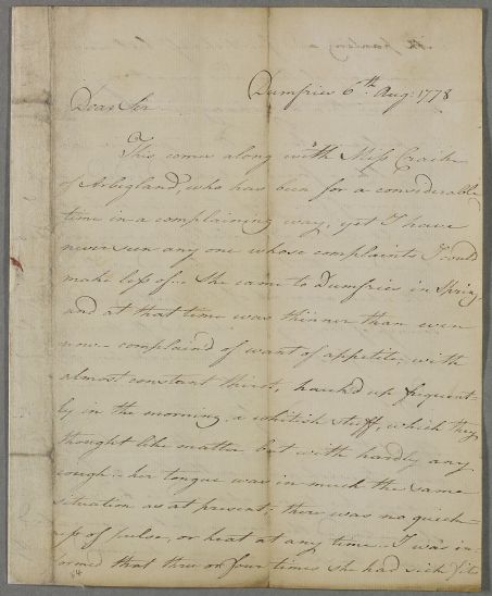 [ID:1544] From: Dr William Hamilton (in Dumfries) / To: Dr William Cullen (Professor Cullen) / Regarding: Miss Elizabeth Craik (Betty Craick) (Patient) / 6 August 1778 / (Incoming)
