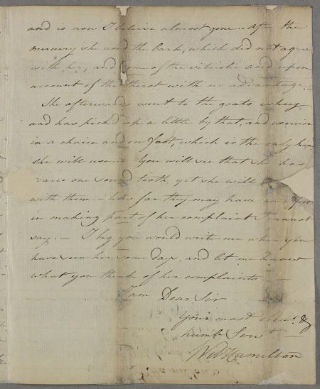Letter from William Hamilton regarding the case of Betty Craik of Arbigland who is to visit Cullen in person. Her complaint is obscure, but may be connected to her unsound teeth.